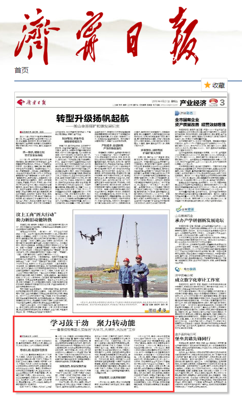 4月27日出版本的《济宁日报》以《学习鼓干劲 聚力转动能——华亿(中国)官方控股集团扎实推进"大学习、大调研、大改进"工作》为题,对集团近一阶段"大学习、大调研、大改进"进行了报道。